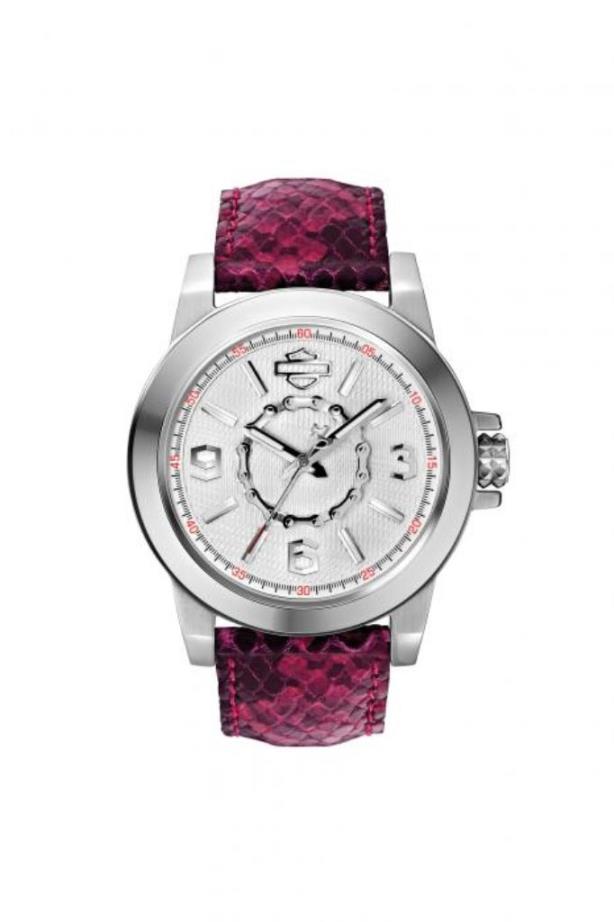 Schöne Damenuhr aus der Boyfriend Kollection. Strukturiertes silber-weißes Zifferblatt. Silberne Zeiger aus H-D Gegengewicht. Gehäuse aus Edelstahl. Fuchsia und Schwarzes Python Lederband.76L172