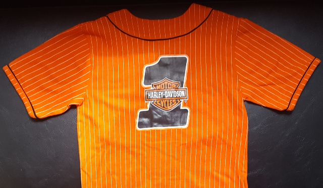 Baseball Outfit mit ogangem T-Shirt und schwarzen Streifen und blauer Jeanshose. Das Outfit hat den H-D Schriftzug und das Nummer 1. Logo.839657-000O/7